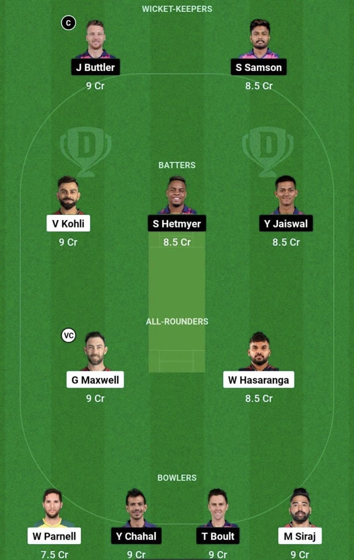 RCB vs RR Dream11 Team Grand League