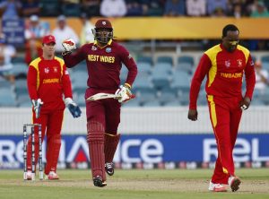 West Indies batsman Chris Gayle celebrates as he scores his century during their World Cup Cricket match against Zimbabwe in Canberra